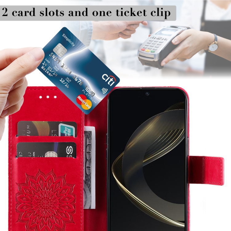 La Funda para Huawei Nova 12 Se y Nova 11 Se de Cuero con Tapa y patrón de girasol en relieve (Rojo) es un Accesorio diseñado para ofrecer protección y funcionalidad avanzada a estos modelos específicos. Fabricada con materiales PU y TPU, esta Funda combina durabilidad y resistencia al desgaste para un uso prolongado. Su diseño incorpora una Tapa con Soporte integrado que permite liberar las manos durante la lectura o la visualización de contenido multimedia. Además, cuenta con ranuras para Tarjetas, facilitando el Almacenamiento de Tarjetas y efectivo, y mantiene el acceso Completo a Botones, Puertos y Conexión para Auriculares sin necesidad de retirar la Funda. Su color Rojo y el patrón en relieve aportan un acabado estético distintivo y elegante.