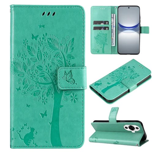 - 1x Funda para Huawei Nova 12S de Cuero con Tapa y Patrón en Relieve de Árbol y Gato (Verde)