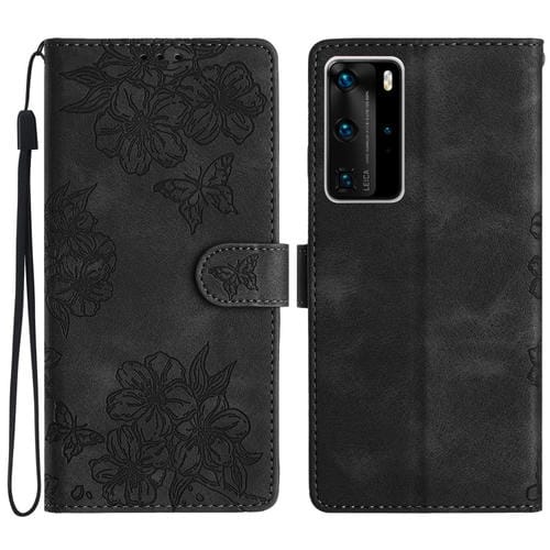Funda para Huawei P40 Pro Cherry Blossom Butterfly Skin Feel en PU Relieve (Negro)
