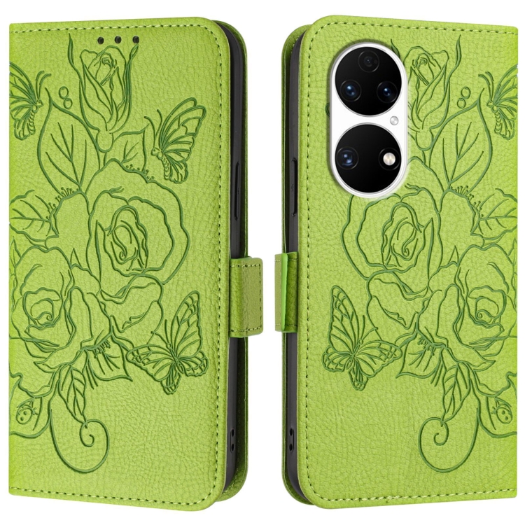Funda para Teléfono Huawei P50 de Cuero Antirrobo RFID con Rosa en Relieve (Verde)