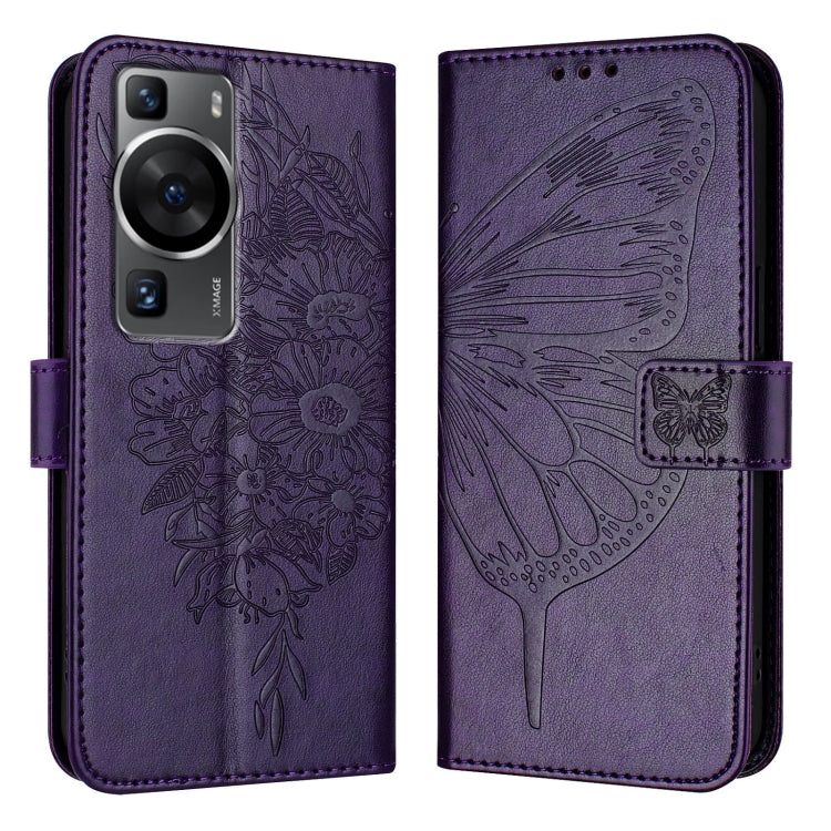 Funda de Cuero Huawei P60 y P60 Pro con Mariposa en Relieve (Púrpura Oscuro)