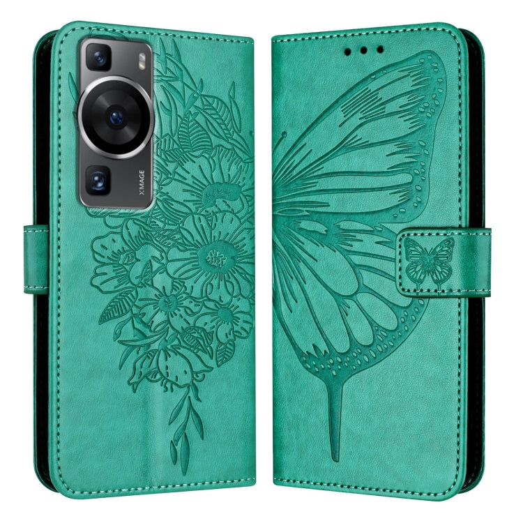Funda de Cuero para Huawei P60 y P60 Pro con Mariposa en Relieve (Verde)