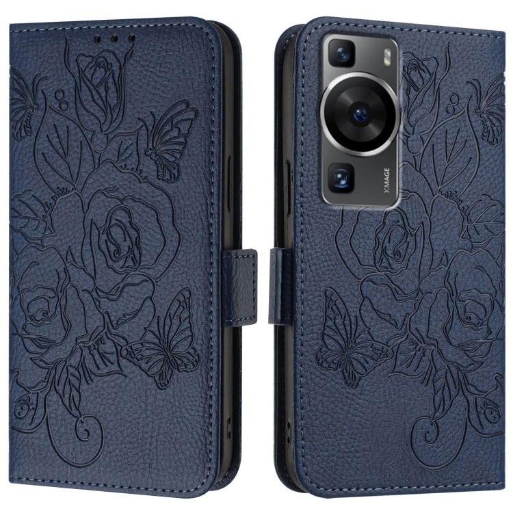 Funda de Cuero Antirrobo RFID para Huawei P60 y P60 Pro con Relieve Rosa (Azul Oscuro)