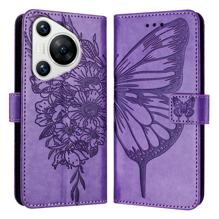 Funda de Cuero para Huawei Pura 70 con Mariposa en Relieve (Púrpura)