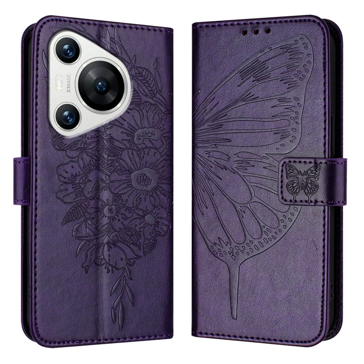 Funda de Cuero para Huawei Pura 70 con Mariposa en Relieve (Púrpura Oscuro)