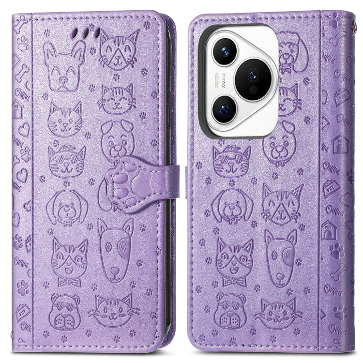 Funda de Cuero Huawei Pura 70 Pro con Relieve Perros y Gatos (Púrpura)