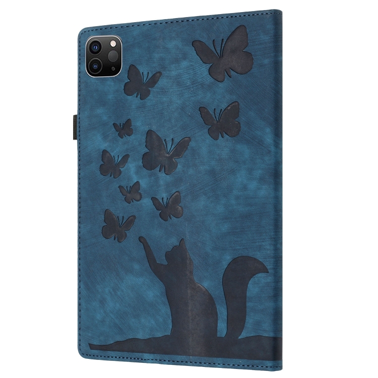 Funda de Piel para iPad Pro 11 (2024) con Estampado de Mariposa y Gato (Azul Oscuro)