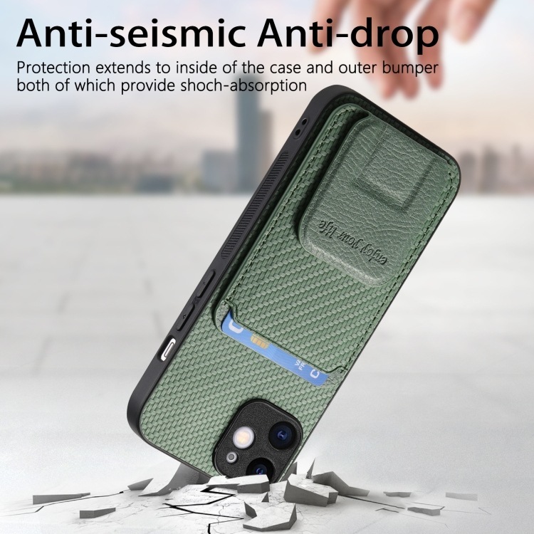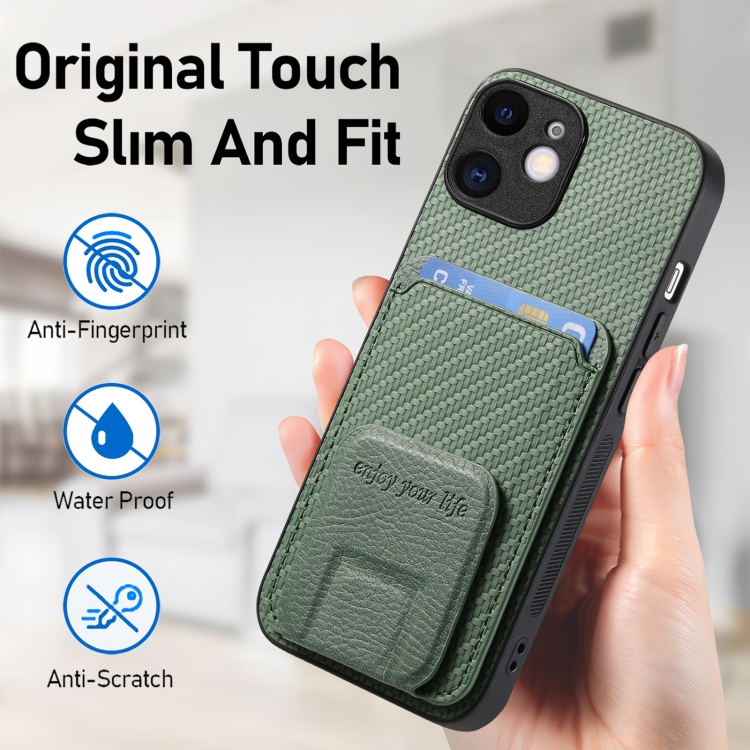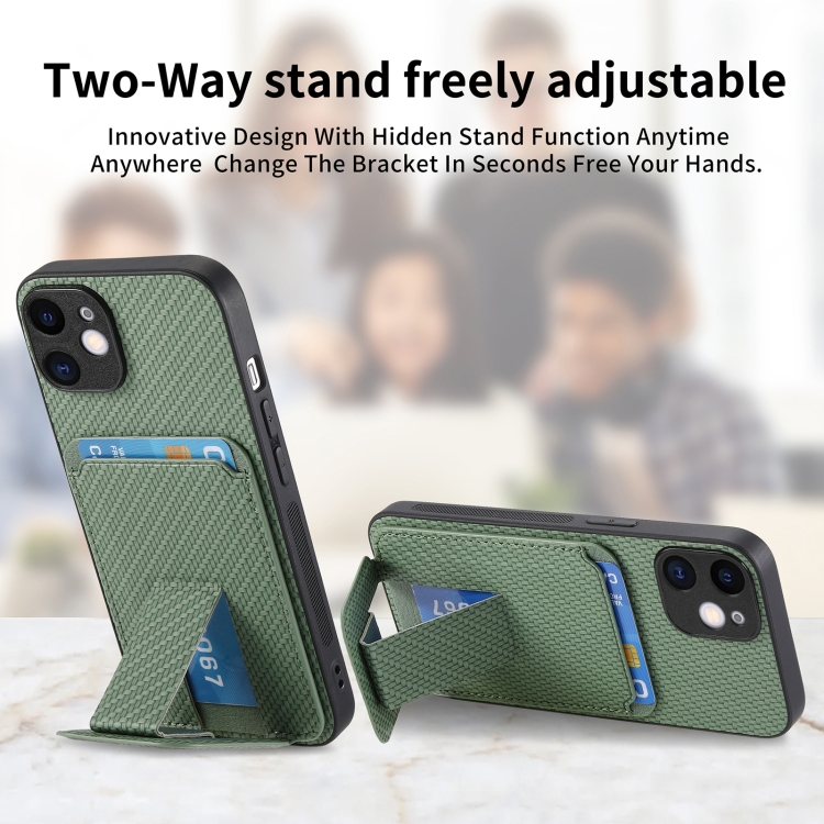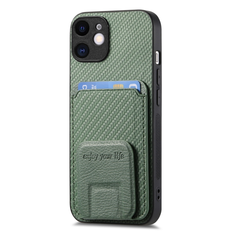 Funda para Teléfono iPhone 11 con Soporte Plegable y Bolsa para Tarjetas de Fibra de Carbono (Verde)