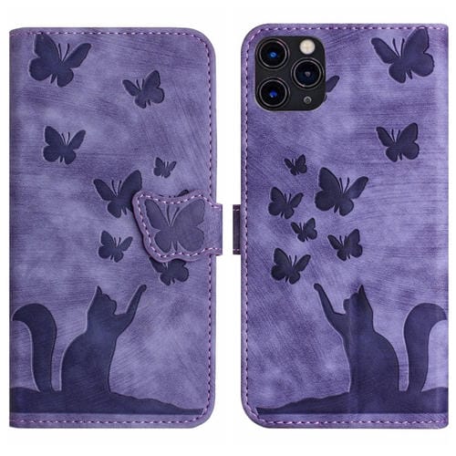Funda de teléfono para iPhone 11 Pro Butterfly Cat de cuero con tapa en relieve (Púrpura)