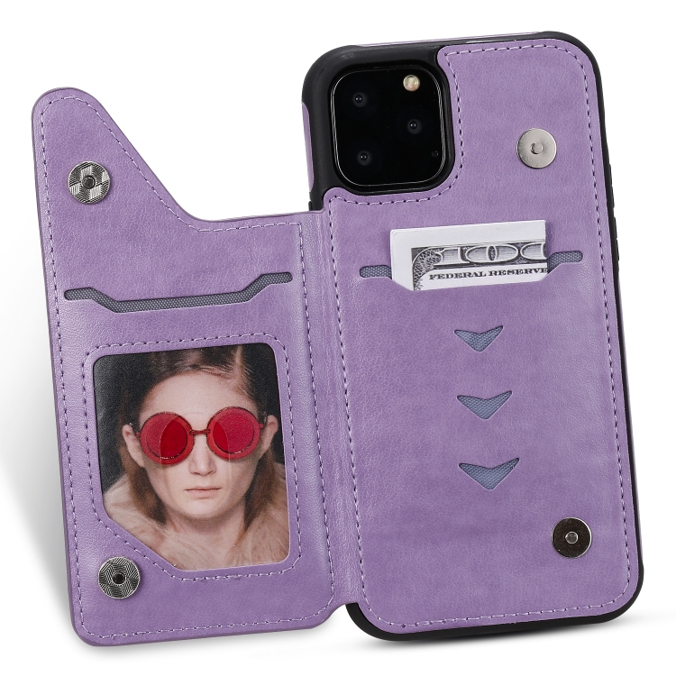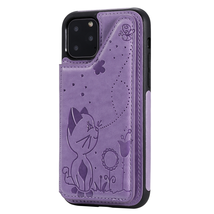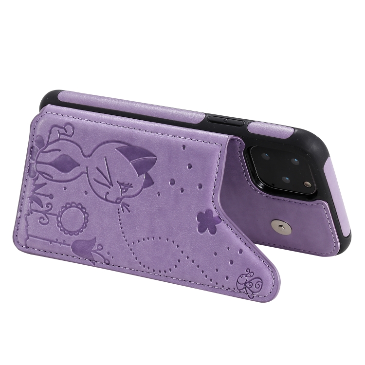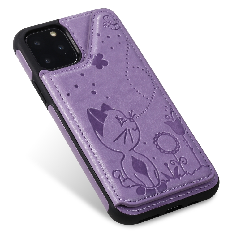 Estuche protector para iPhone 11 Pro Cat Bee patrón en relieve con ranuras para tarjetas y marco de fotos (Púrpura)