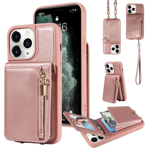 Funda de Cuero para Teléfono iPhone 11 Pro Crossbody Lanyard Zipper Wallet (Oro Rosa)
