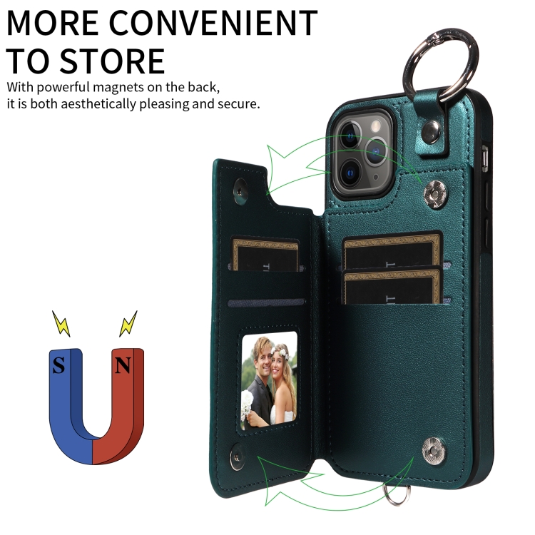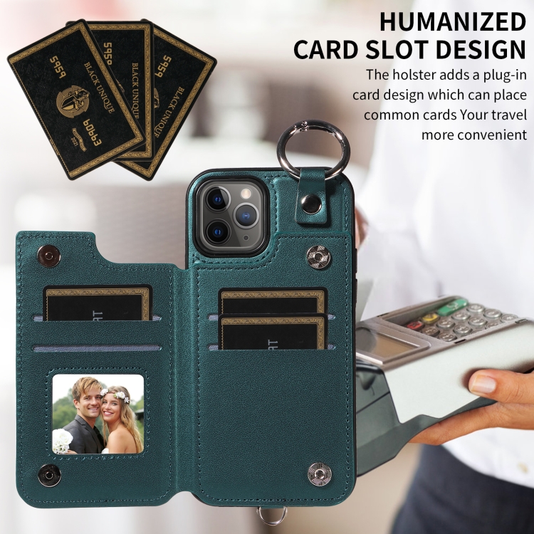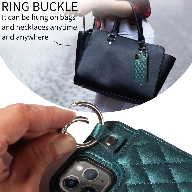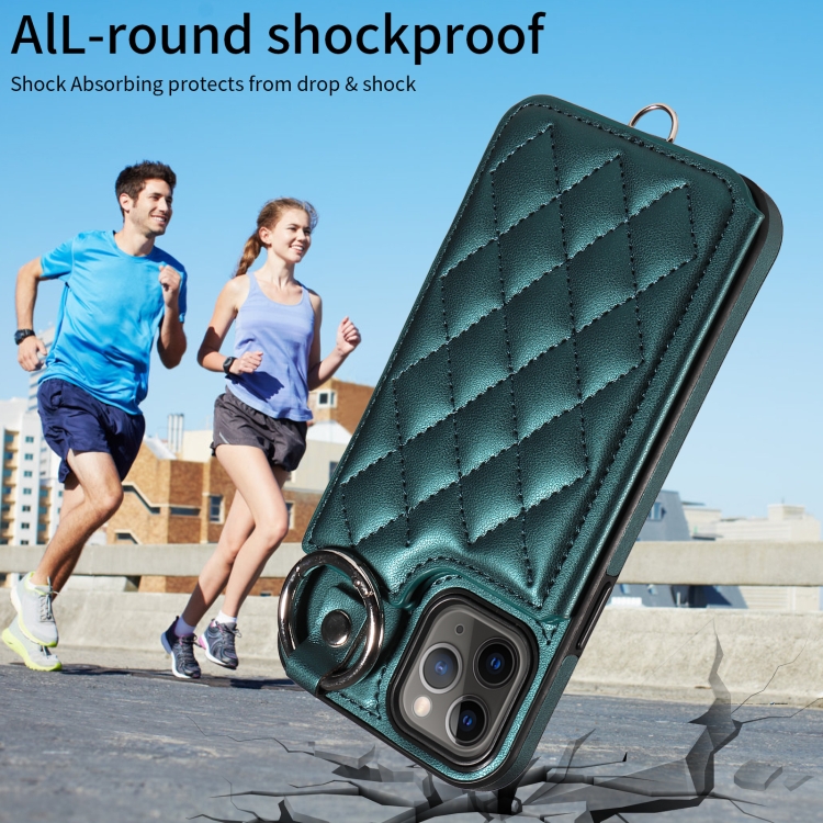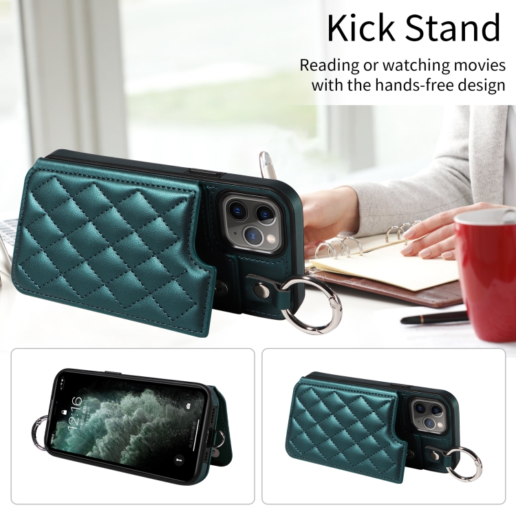 Estuche para Teléfono iPhone 11 Pro con Bolsa para Tarjetas Textura Rómbica y Cordón Corto (Verde)
