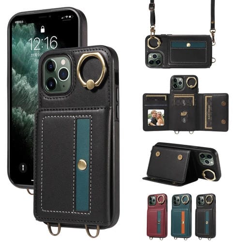 For iPhone 11 Pro Leather Phone Case with Ring Holder and Crossbody Card Bag (Black)