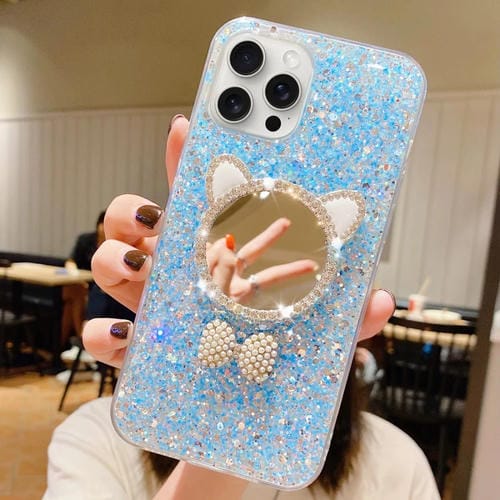 Estuche para Teléfono iPhone 11 Pro Max TPU Epoxi Orejas de Gato Diamantes Lentejuelas Estrelladas (Azul)