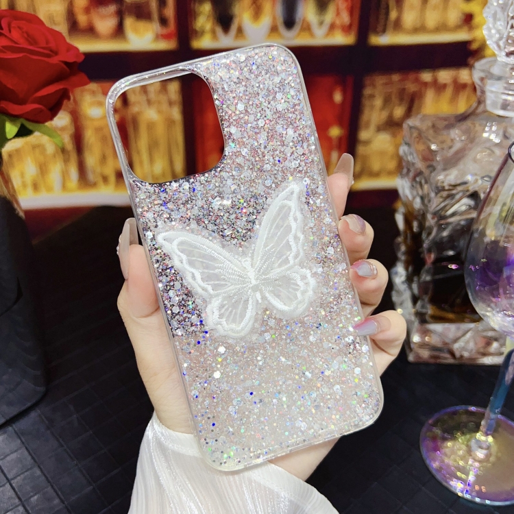 Funda para Teléfono TPU Epoxi iPhone 11 Pro Max Mariposa Bordada Lentejuelas Estrelladas (Plateado)