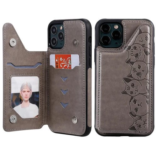 Estuche protector para iPhone 11 Pro Six Cats con patrón en relieve soporte ranuras para tarjetas y marco de fotos (Gris)