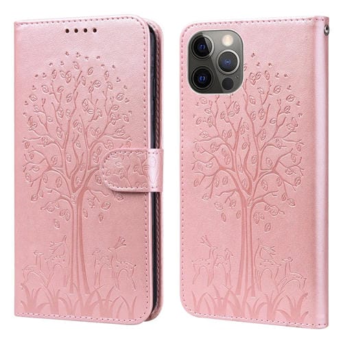 Funda de cuero para teléfono iPhone 11 Pro Tree & Deer Patrón Prensado Impresión Horizontal Flip (Rosa)