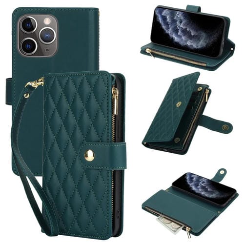 Funda para iPhone 11 Pro Ym016 Cuero con Billetera, Tarjeta, Cremallera Rómbica y Cordón (Verde)