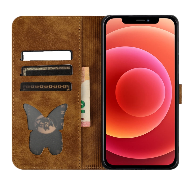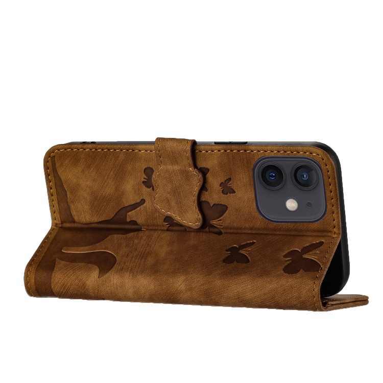For iPhone 12/12 Pro Butterfly Cat Embossed Flip Leather Phone Case (Brown)