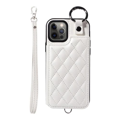 Estuche para Teléfono iPhone 12/12 Pro con Bolsa para Tarjetas Textura Rómbica y Cordón Corto (Blanco)