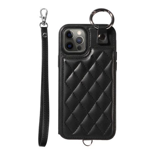 Estuche para Teléfono iPhone 12/12 Pro con Bolsa para Tarjetas Textura Rómbica y Cordón Corto (Negro)