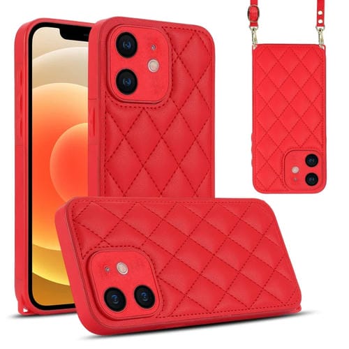 Estuche para Teléfono iPhone 12 con Textura Rómbica y Cordón Doble (Rojo)