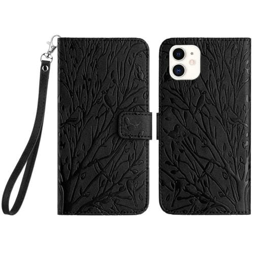 Funda de Teléfono iPhone 12 Cuero Patrón En Relieve Pájaros de Árbol (Negro)
