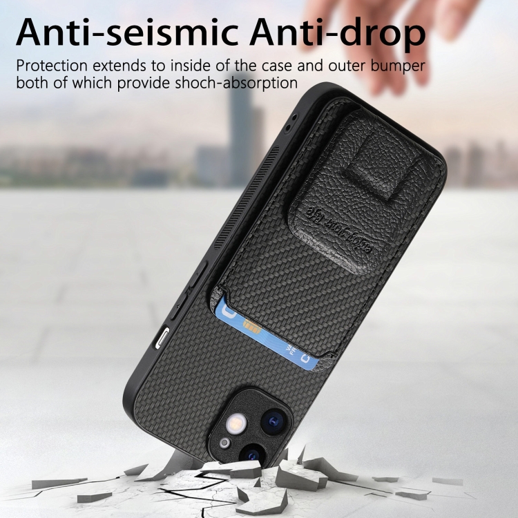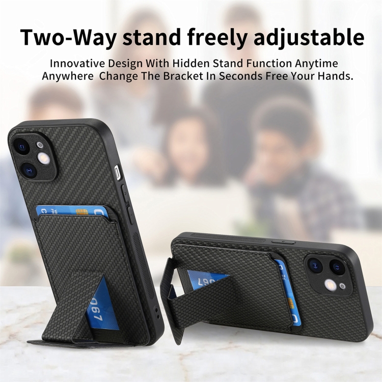 Funda para Teléfono iPhone 12 con Soporte Plegable y Bolsa para Tarjetas Fibra de Carbono (Negro)