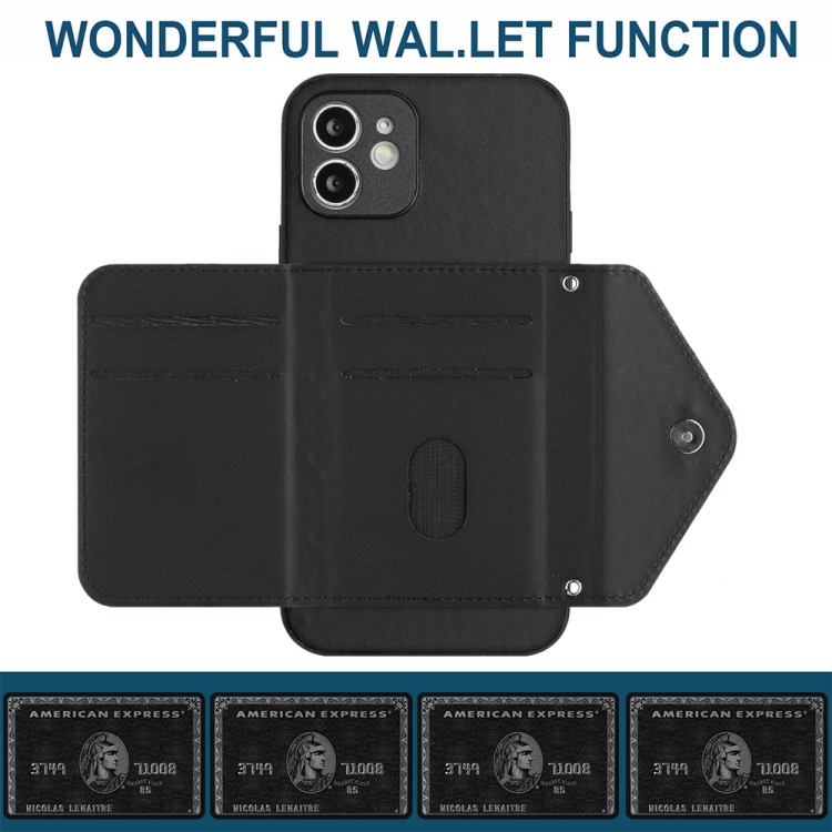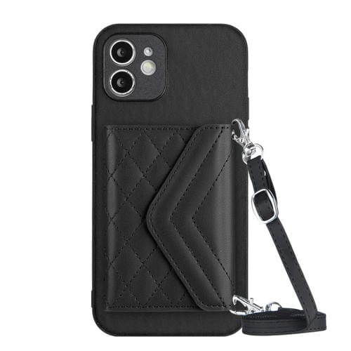 Estuche para Teléfono iPhone 12 Mini Rfid con Bolsa para Tarjetas Textura Rómbica y Cordón Largo (Negro)