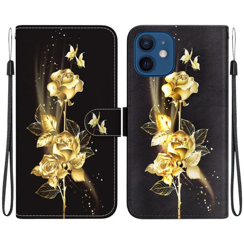 Funda de Cuero para iPhone 12 Mini con Dibujo Coloreado y Textura de Cristal (Mariposa Dorada Rosa)