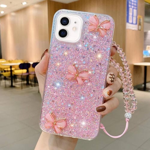Funda para teléfono TPU Epoxi iPhone 12 Mini con Mariposa de Jade y Lentejuelas Estrelladas con Correa (Rosa)
