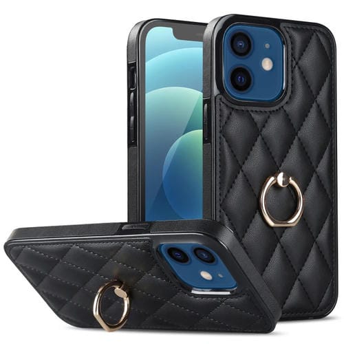 Funda de Cuero Rhombic para iPhone 12 Mini con Soporte para Anillo (Negro)