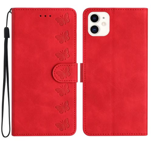 Funda de Cuero para iPhone 12 Mini Seven Butterflies en Relieve (Rojo)