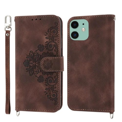 Funda de cuero para iPhone 12 Mini Skin-Feel Flowers con billetera en relieve (Marrón)