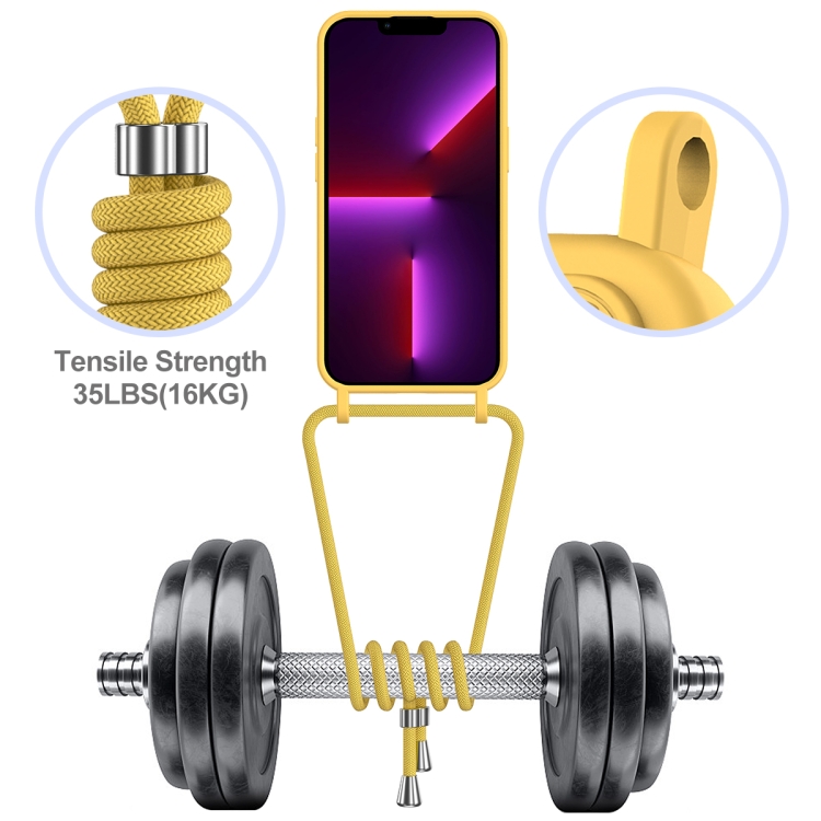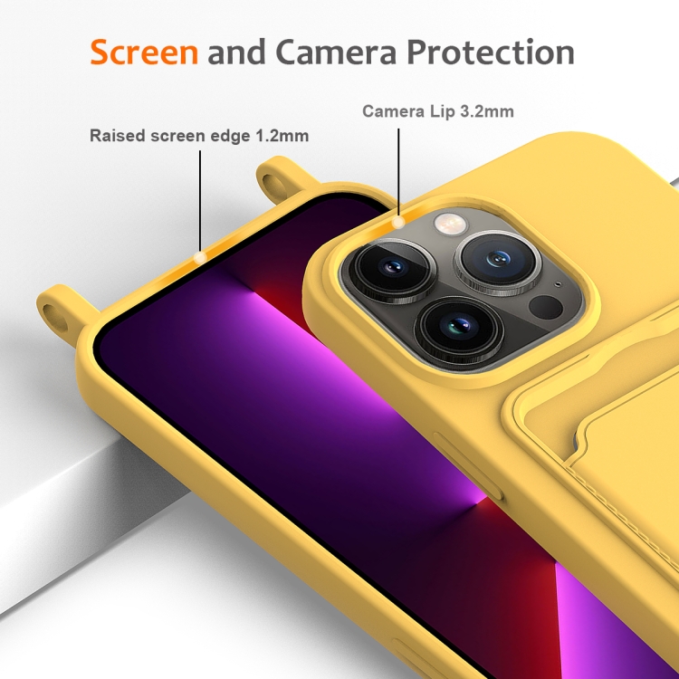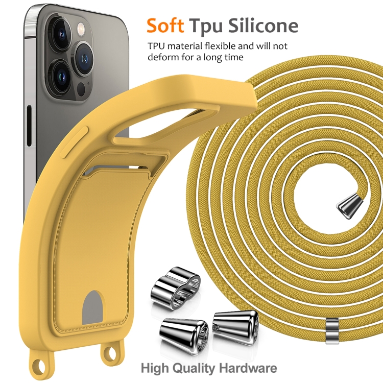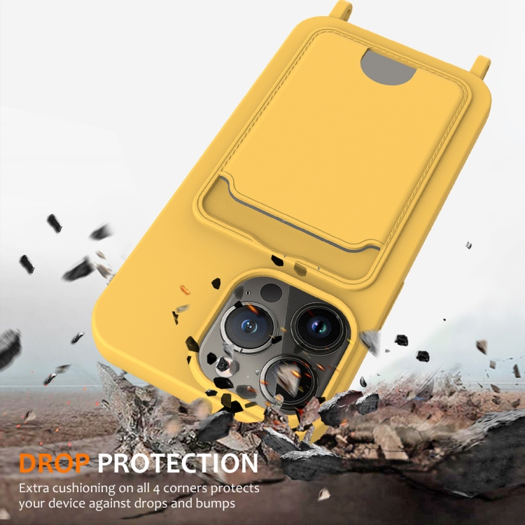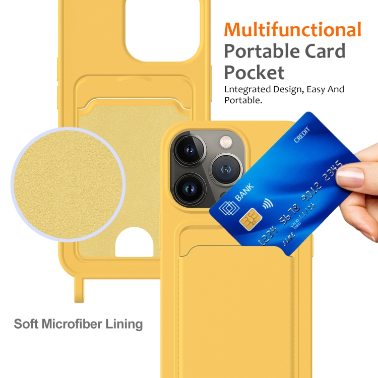 For iPhone 12 Pro Built-in Card Bag Solid Color Liquid Silicone Phone Case with Lanyard (Yellow)
