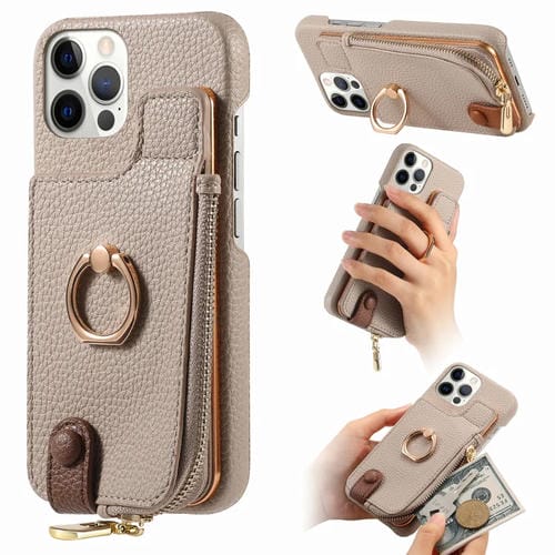 Funda Trasera para iPhone 12 Pro con billetera, cremallera y anillo de cuero litchi (Caqui)