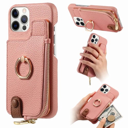 Funda Trasera para iPhone 12 Pro con Billetera, Cremallera y Anillo de Cuero Litchi (Rosa)