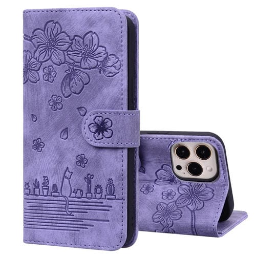 Estuche de Cuero para iPhone 12 Pro Max Cartoon Sakura Cat En Relieve (Púrpura)