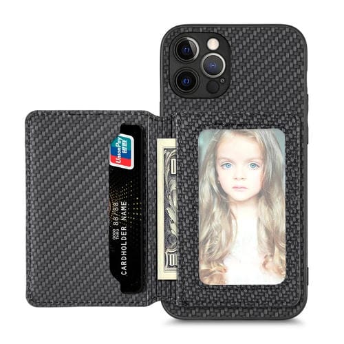 Funda de teléfono iPhone 12 Pro Max con bolsa de tarjeta magnética de fibra de carbono (Negro)