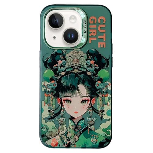 Caja del Teléfono iPhone 13 Estilo Antiguo Chino Lente Galvanizada Anillo PC Híbrido TPU (Chica de Fondo Verde)