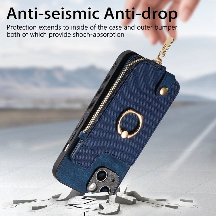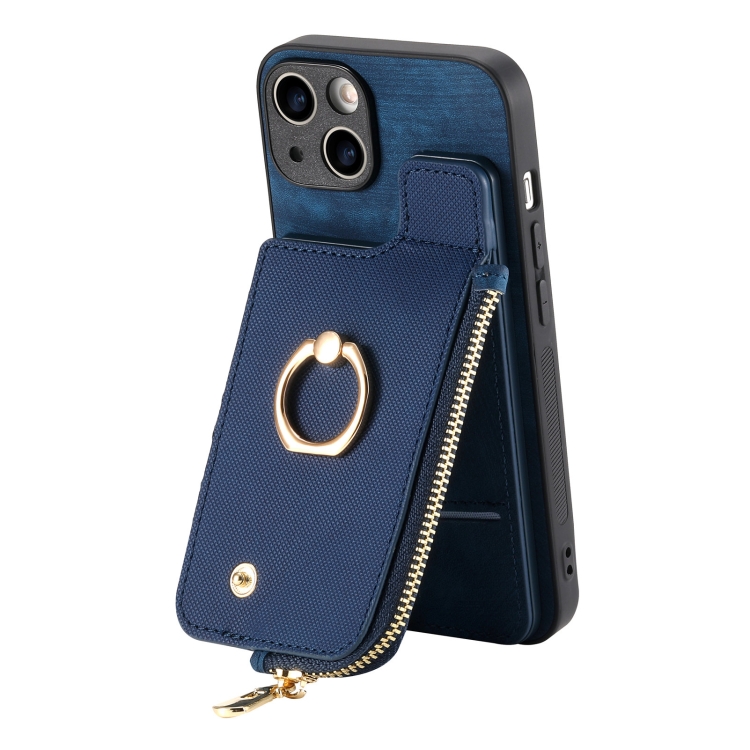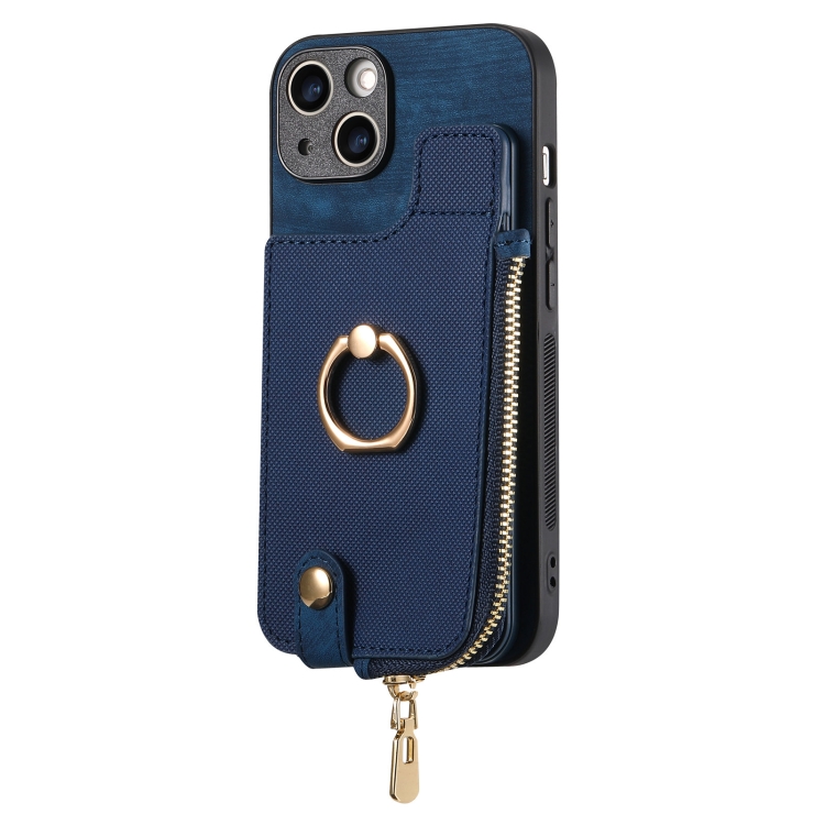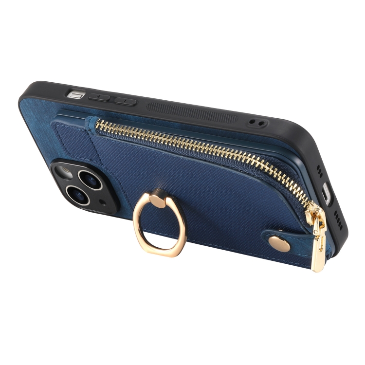 Estuche para Teléfono iPhone 13 con Billetera Cremallera Vertical Anillo de Cuero Cruzado (Azul)