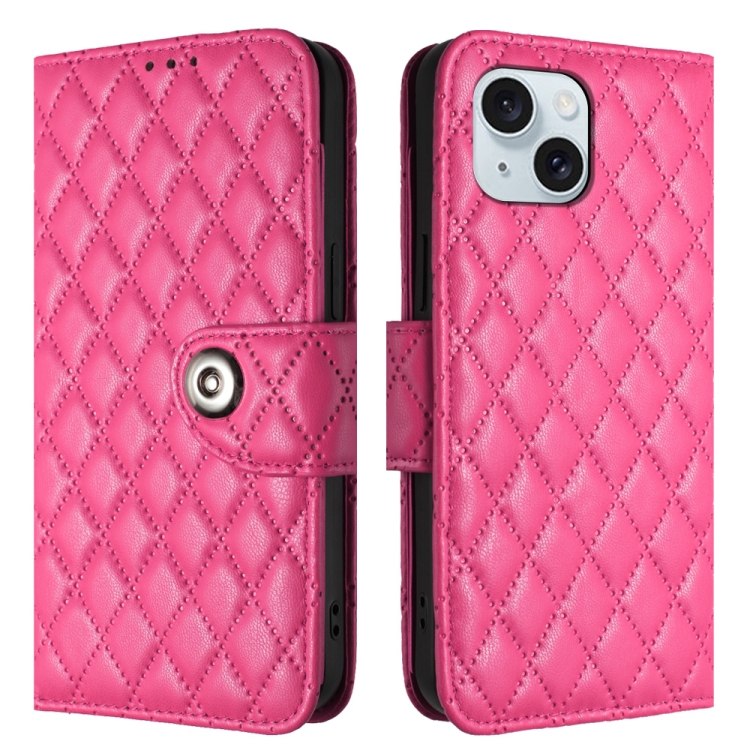 Funda de Cuero para iPhone 13 con Tapa Textura Rómbica y Cordón (Rojo Rosa)