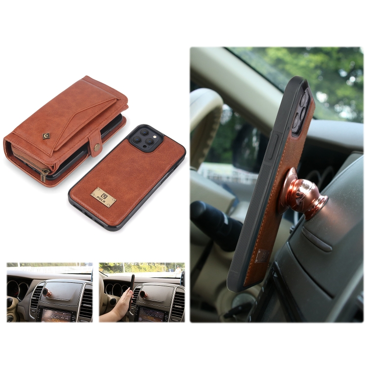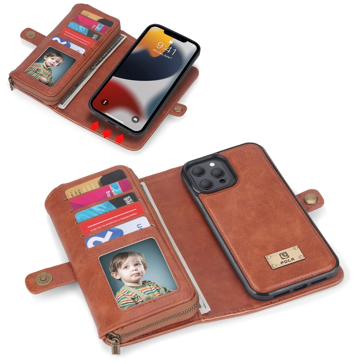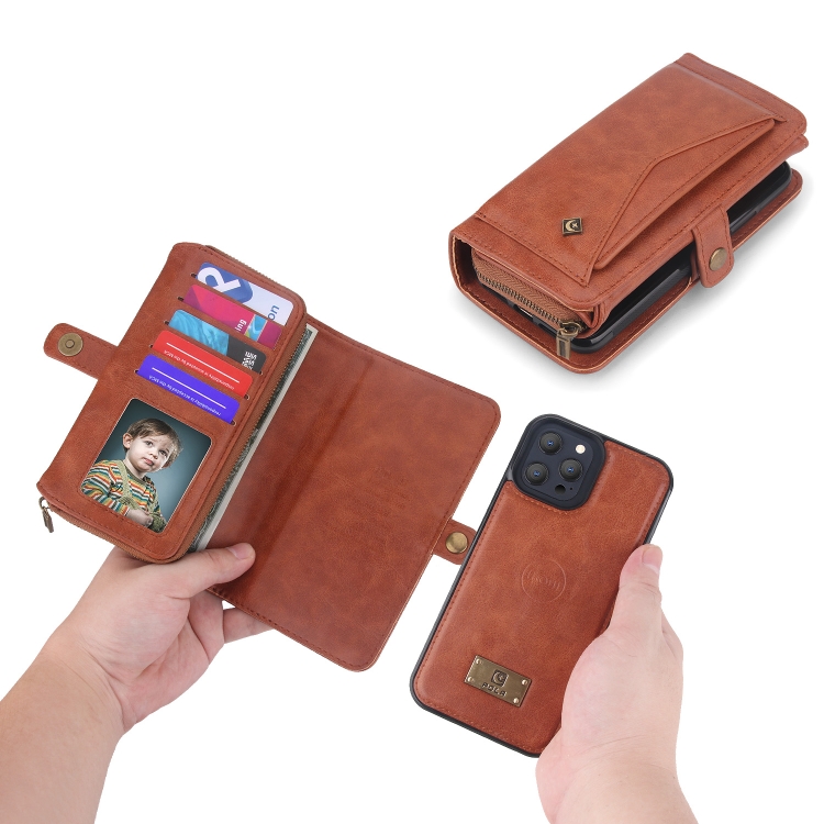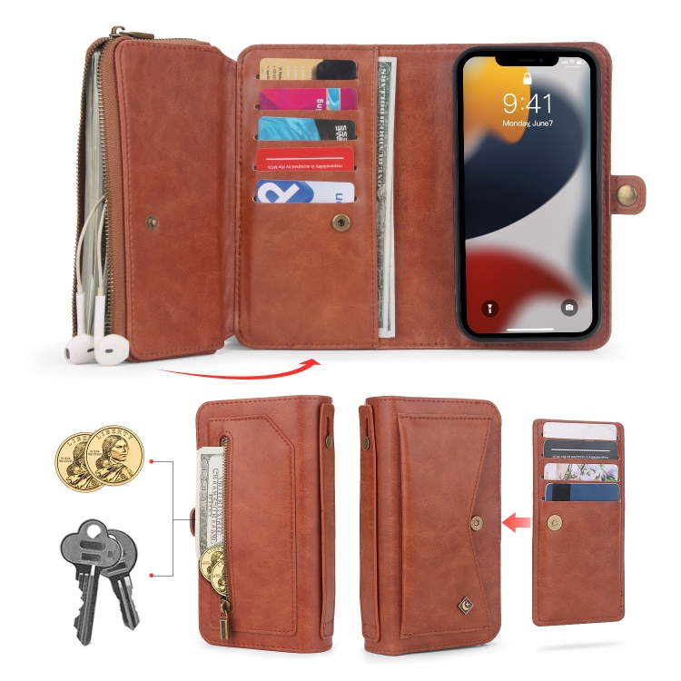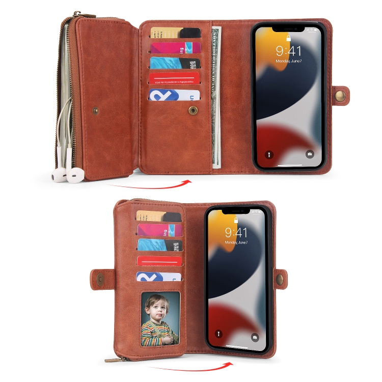 Funda para Teléfono iPhone 13 Cuero con Billetera y Cremallera Multifuncional (Marrón)