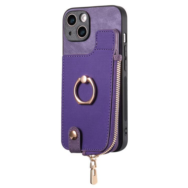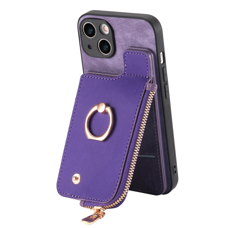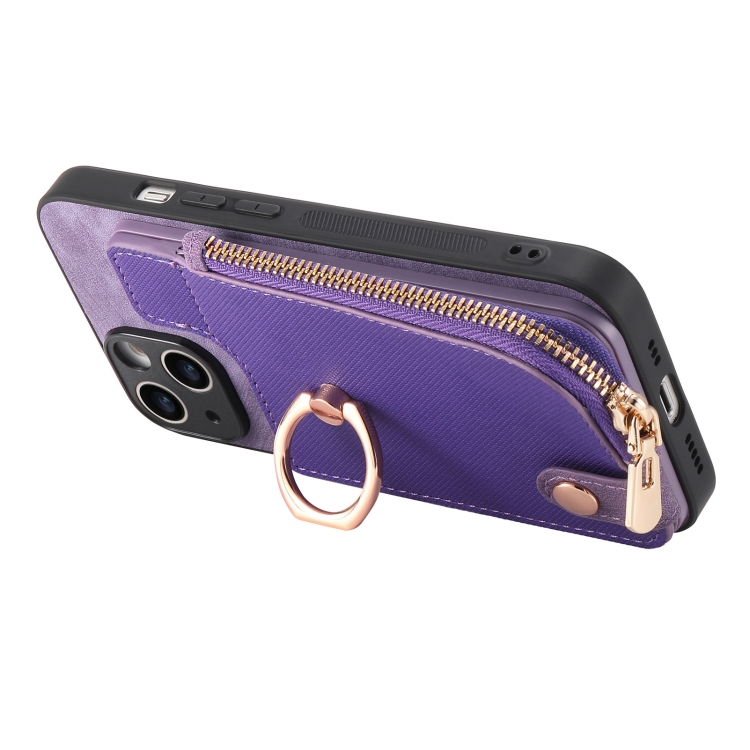 Funda para Teléfono iPhone 13 con Billetera, Cremallera Vertical y Anillo de Cuero Cruzado (Púrpura)