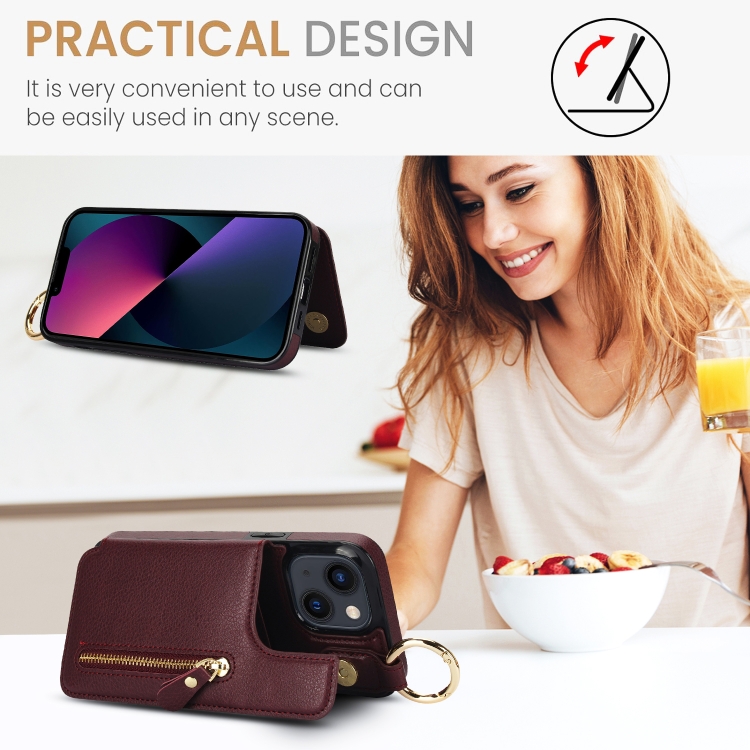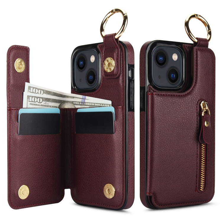 Funda para Teléfono iPhone 13 con Bolsa para Tarjetas Doble Hebilla y Cremallera (Rojo Granate)