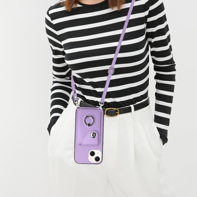 Funda para Teléfono iPhone 13 con Soporte para Anillo y Bolsa para Tarjeta con Cordón Largo (Púrpura)