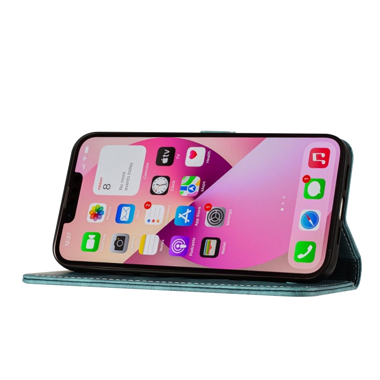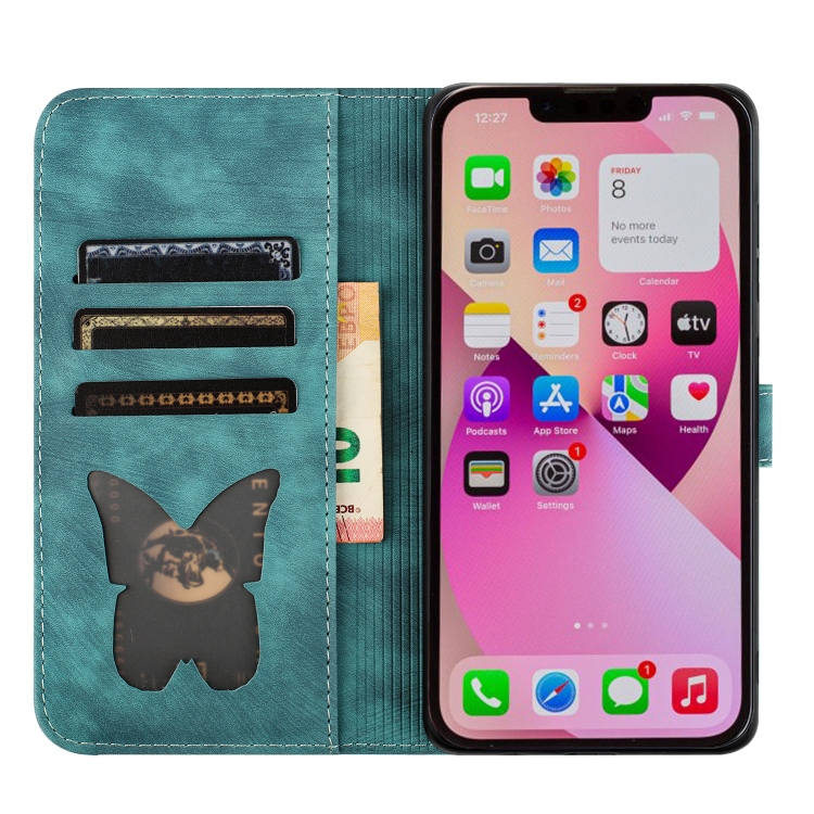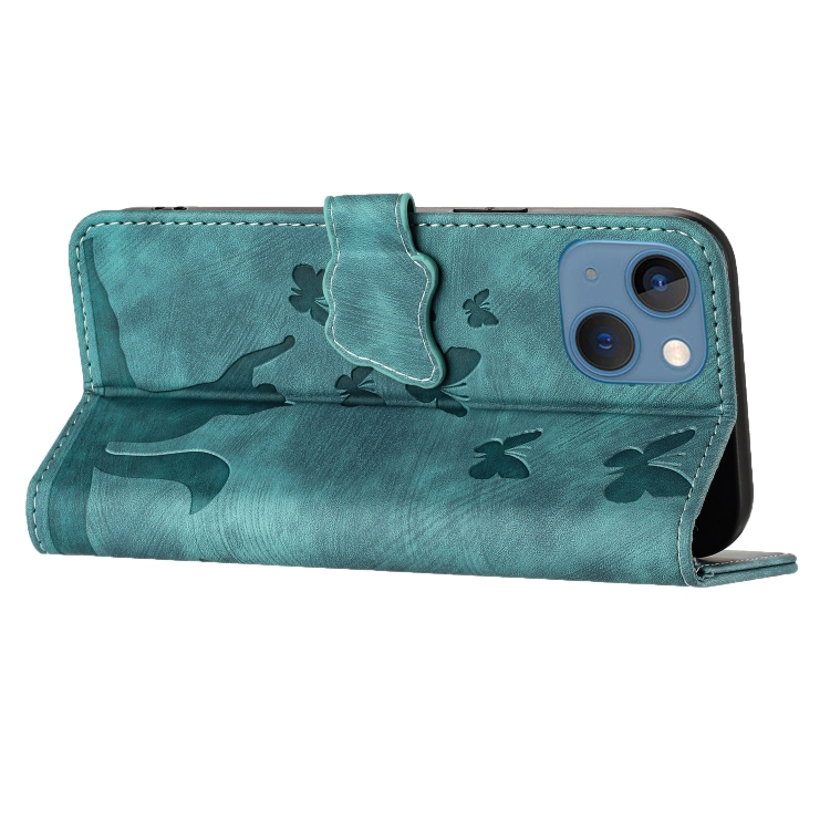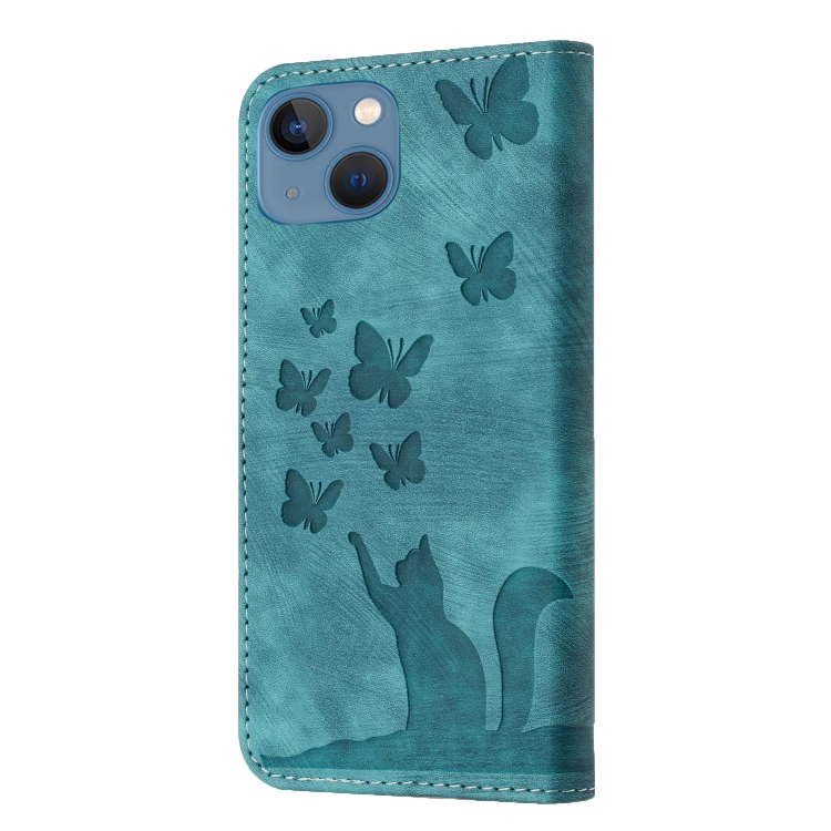 Funda para Teléfono iPhone 13 Cuero con Tapa y Estampado de Gato Mariposa (Wathet)