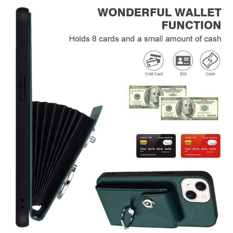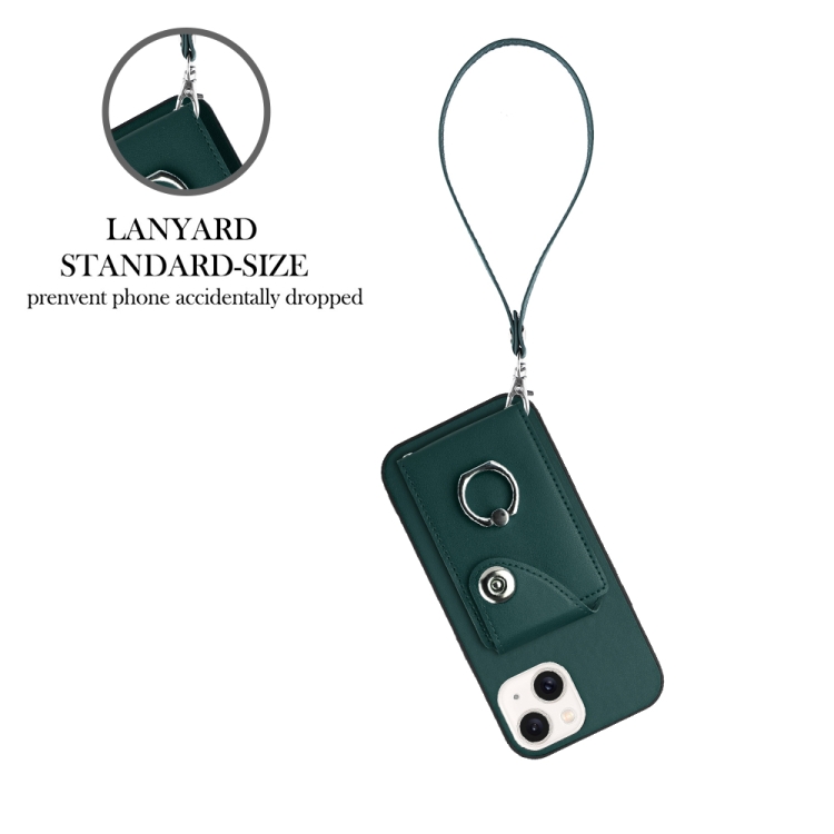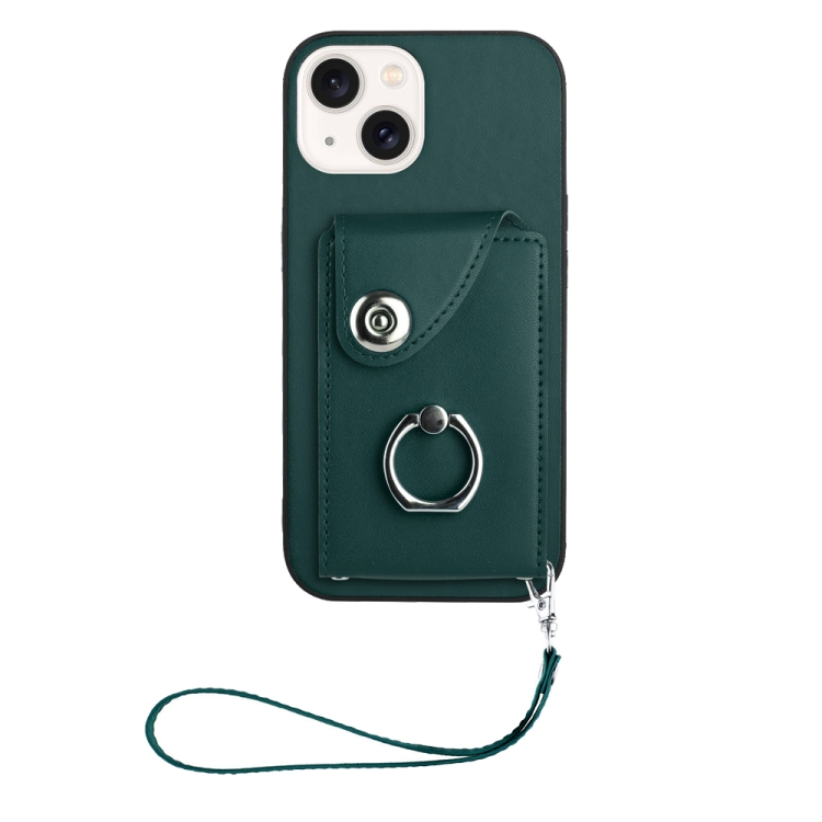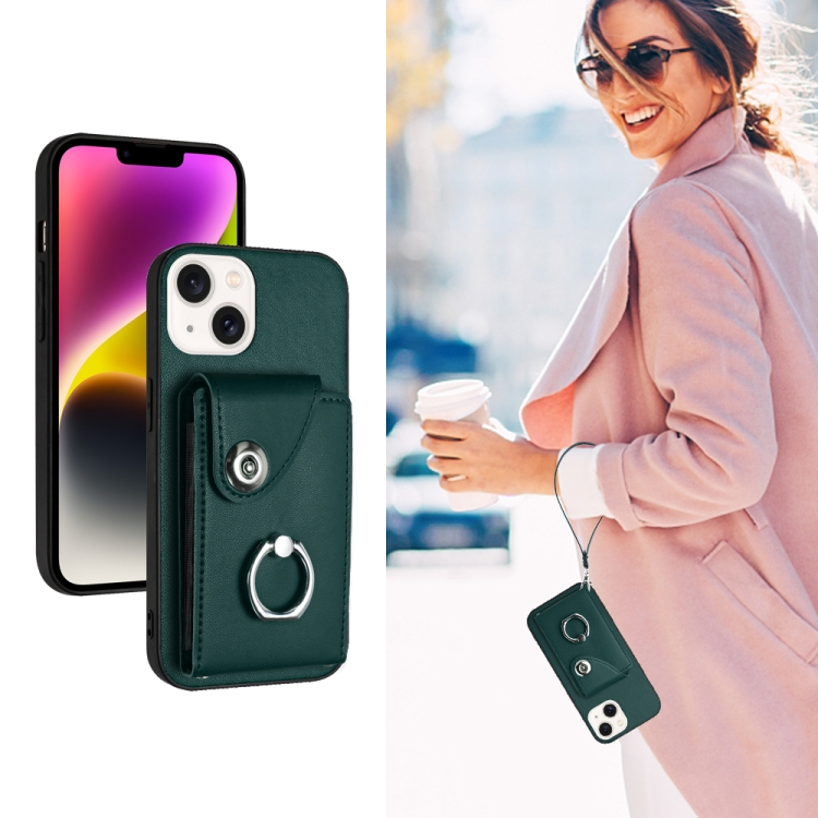 Funda para Teléfono iPhone 13 de PU con Soporte para Anillo y Bolsa para Tarjeta con Cordón (Verde)