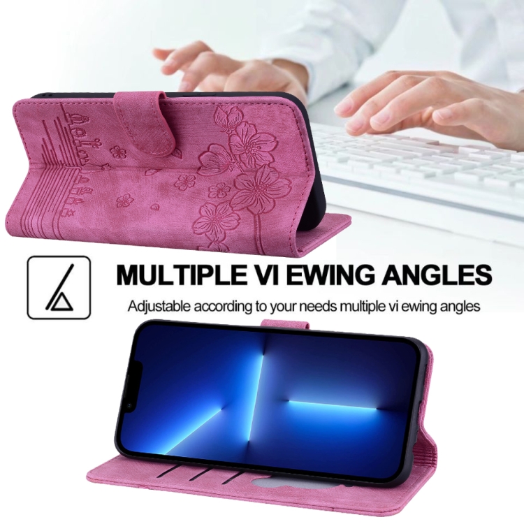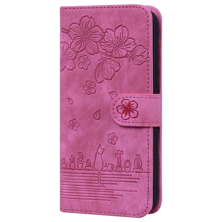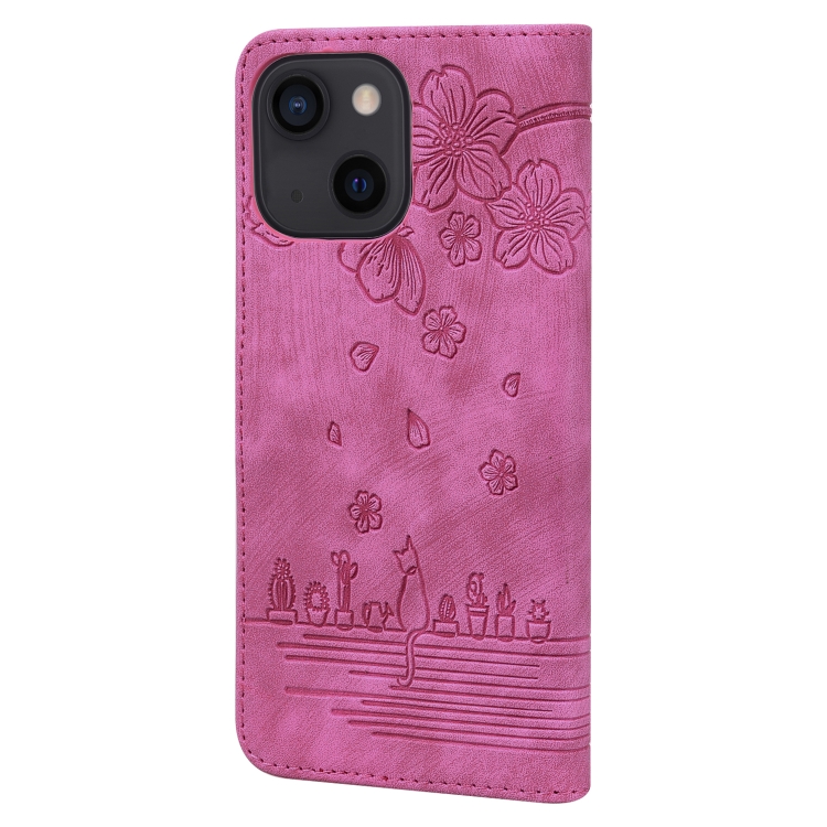 Estuche de Cuero para iPhone 13 Mini Cartoon Sakura Cat En Relieve (Rose Red)