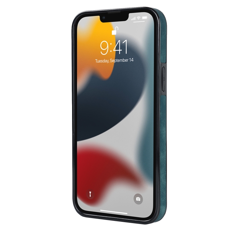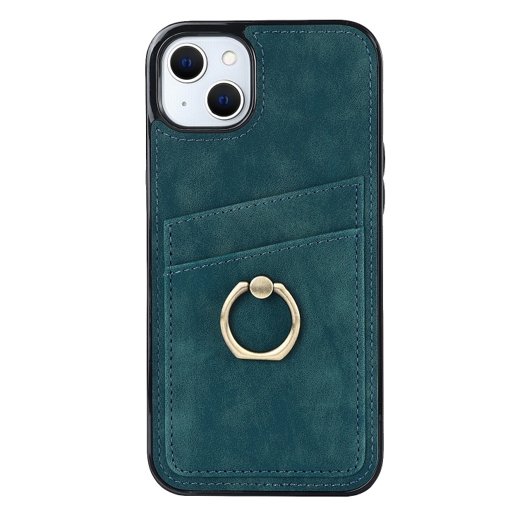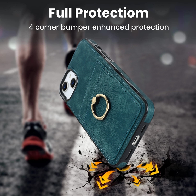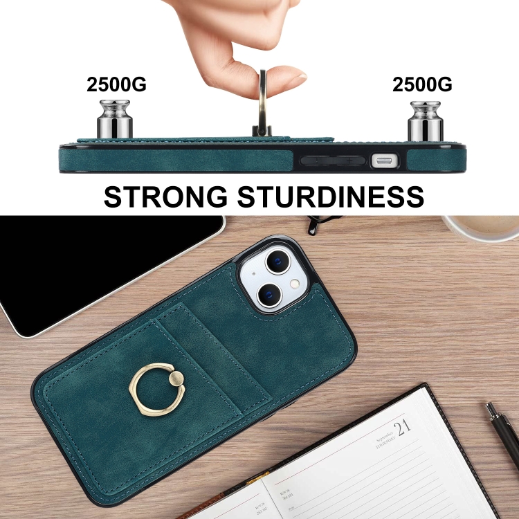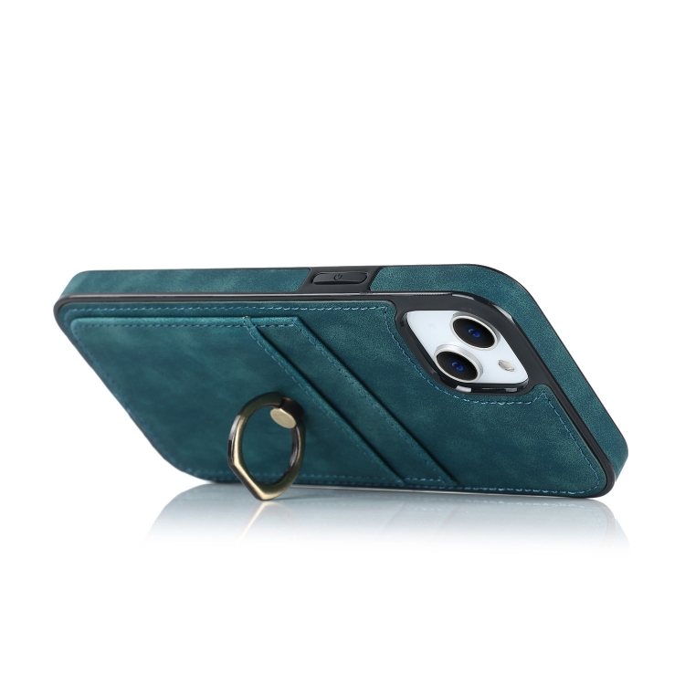 Funda de Cuero para iPhone 13 Mini con Parche Vintage y Soporte para Anillo (Azul)